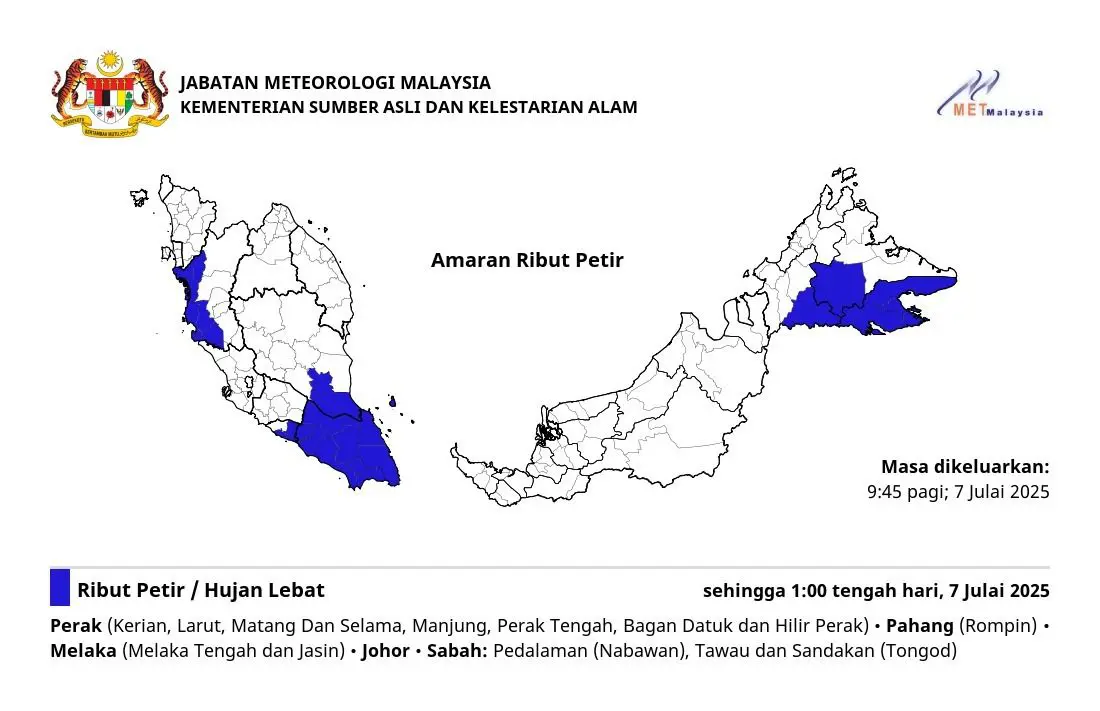 | 7 Julai | Selangor, Kuala Lumpur, Negeri Sembilan, Melaka, Johor | Dari 7:00 AM hingga selesai kedatangan delegasi | Ribut petir, hujan lebat |