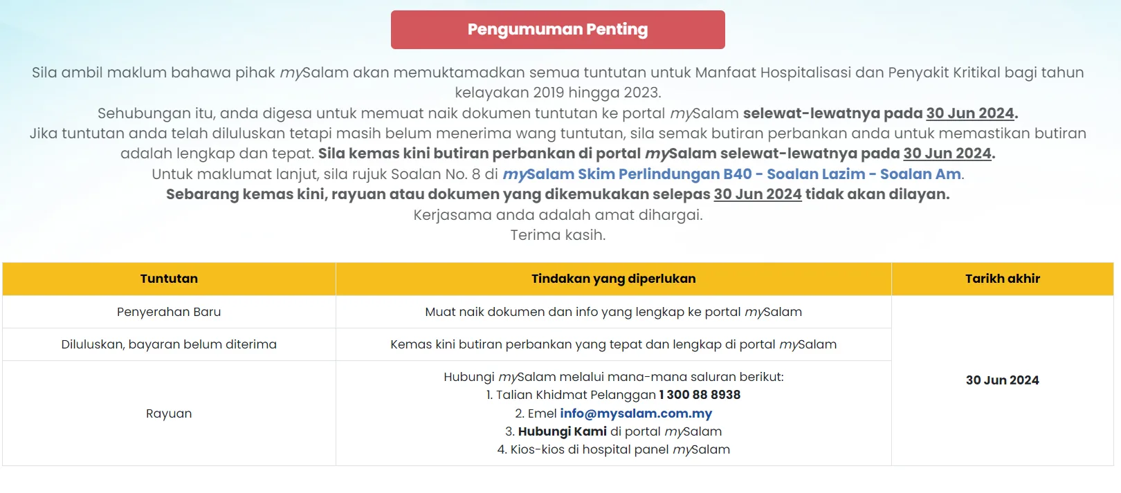 Bagi yang layak, tuntutan boleh dibuat selagi program skim bantuan ini masih terbuka. Untuk panduan lengkap dan butiran penuh, sila layari laman rasmi MySalam.