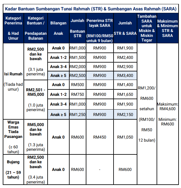 Berikut adalah jadual jumlah bayaran yang akan diterima oleh penerima yang berkelayakan :